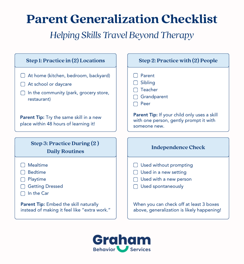 In Part 1, we covered what generalization means and the difference between stimulus and response generalization. Now, let’s look at how ABA therapy actively builds these skills and how you can support them at home.