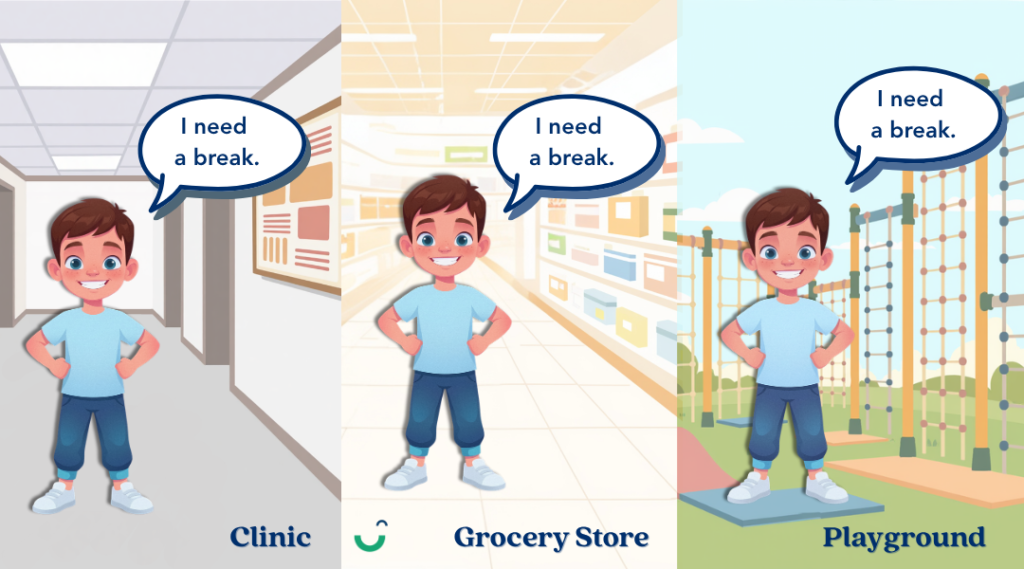A child learns to say “I need a break” in the clinic and later uses it at the grocery store or playground.