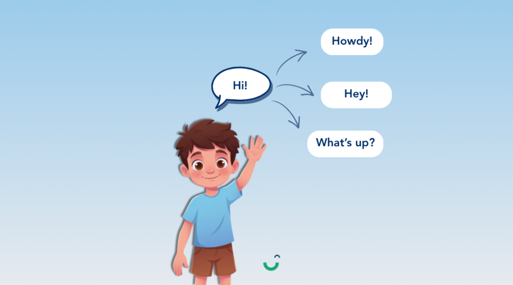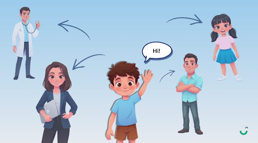 A child greets their therapist and then begins greeting teachers, grandparents, or peers.