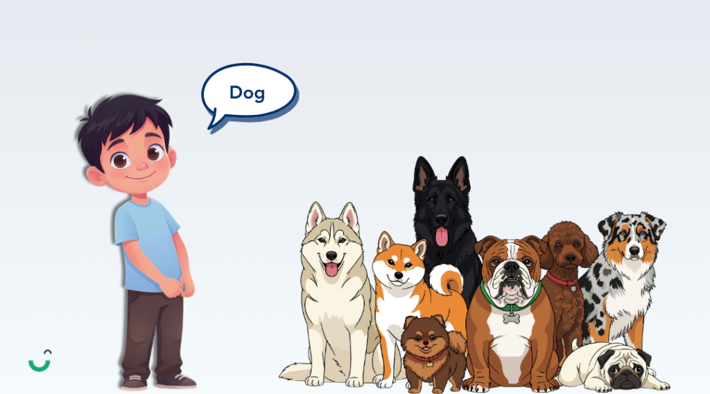 A child learns to label a terrier, pug, and golden retriever as “dog.”